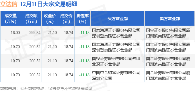 证券之星消息,12月11日立达信发生大宗交易,交易数据如下: