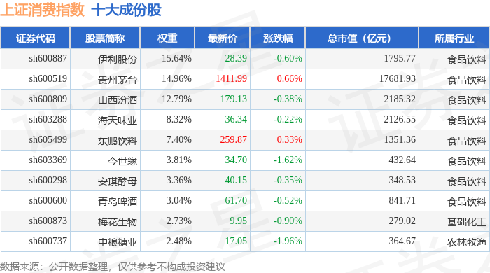 证券之星消息,12月11日,上证消费(000036)指数报收于10824.07点,跌0.6%,成交104.78亿元,换手率0.81%。当日该指数成份股中,上涨的有6家,华熙生物以0.72%的涨幅领涨,下跌的有24家,养元饮品以4.99%的跌幅领跌。