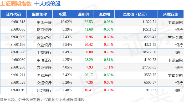 上证周期(000063)指数十大成份股详情如下: