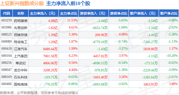 资金流向方面,上证新兴(000067)指数成份股当日主力资金净流出合计42.06亿元,游资资金净流入合计14.17亿元,散户资金净流入合计27.9亿元。成份股资金流向详情见下表: