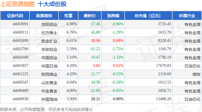 证券之星消息,12月11日,上证资源(000068)指数报收于3767.61点,跌0.83%,成交458.84亿元,换手率0.55%。当日该指数成份股中,上涨的有8家,西部超导以4.95%的涨幅领涨,下跌的有37家,东阳光以5.47%的跌幅领跌。