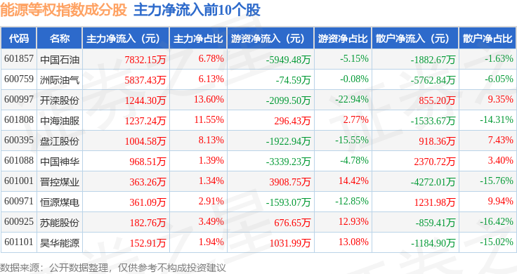 资金流向方面,能源等权(000070)指数成份股当日主力资金净流出合计1.96亿元,游资资金净流入合计9433.98万元,散户资金净流入合计1.01亿元。成份股资金流向详情见下表: