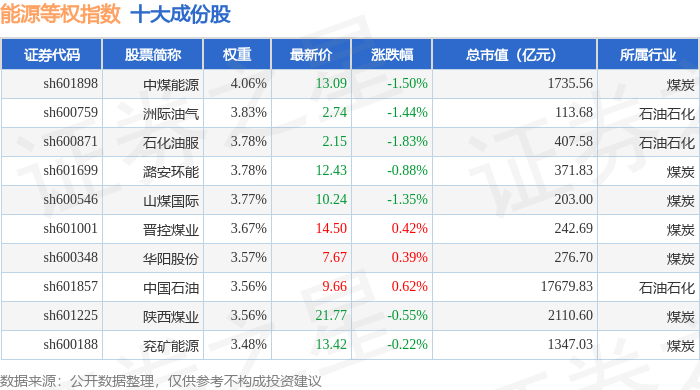 证券之星消息,12月11日,能源等权(000070)指数报收于2599.12点,跌0.72%,成交92.42亿元,换手率0.34%。当日该指数成份股中,上涨的有6家,昊华能源以0.83%的涨幅领涨,下跌的有22家,兰花科创以2.43%的跌幅领跌。