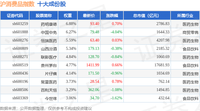 证券之星消息,12月11日,沪消费品(000103)指数报收于8078.68点,跌0.65%,成交236.35亿元,换手率1.0%。当日该指数成份股中,上涨的有15家,昭衍新药以3.0%的涨幅领涨,下跌的有32家,中国中免以4.04%的跌幅领跌。