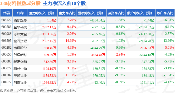 资金流向方面,380材料(000105)指数成份股当日主力资金净流出合计3.39亿元,游资资金净流入合计9159.67万元,散户资金净流入合计2.48亿元。成份股资金流向详情见下表: