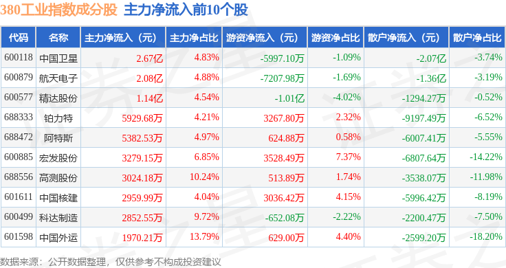 资金流向方面,380工业(000106)指数成份股当日主力资金净流出合计13.32亿元,游资资金净流入合计4.54亿元,散户资金净流入合计8.78亿元。成份股资金流向详情见下表: