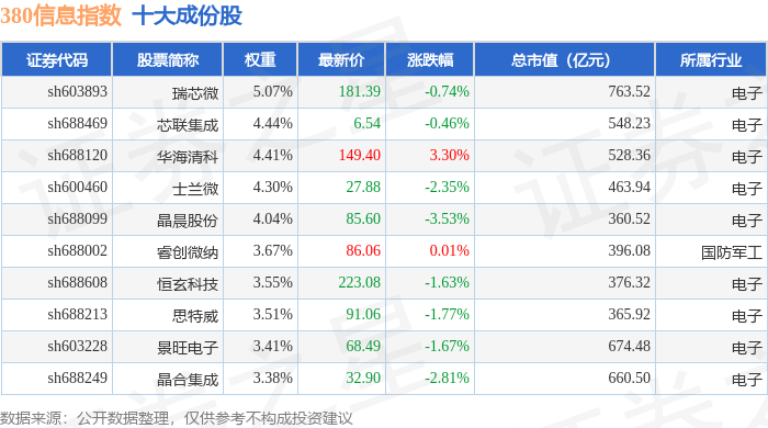 证券之星消息,12月11日,380信息(000111)指数报收于9379.83点,跌1.14%,成交243.87亿元,换手率2.0%。当日该指数成份股中,上涨的有10家,华海清科以3.3%的涨幅领涨,下跌的有36家,顶点软件以4.18%的跌幅领跌。