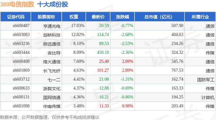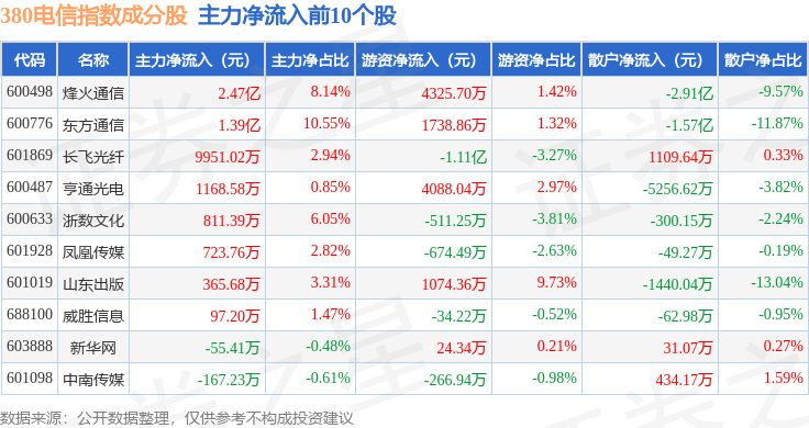 资金流向方面,380电信(000112)指数成份股当日主力资金净流出合计1465.77万元,游资资金净流入合计2.36亿元,散户资金净流出合计2.21亿元。成份股资金流向详情见下表: