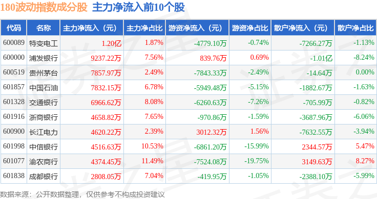 资金流向方面,180波动(000129)指数成份股当日主力资金净流出合计36.75亿元,游资资金净流入合计6.34亿元,散户资金净流入合计30.42亿元。成份股资金流向详情见下表: