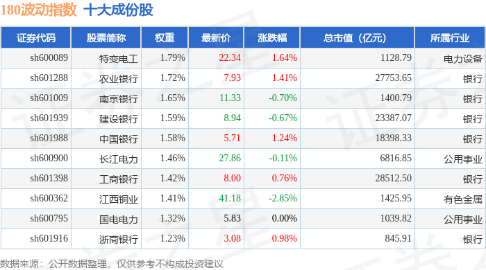 证券之星消息,12月11日,180波动(000129)指数报收于15155.12点,跌0.37%,成交787.2亿元,换手率0.29%。当日该指数成份股中,上涨的有30家,新奥股份以2.21%的涨幅领涨,下跌的有65家,江西铜业以2.85%的跌幅领跌。