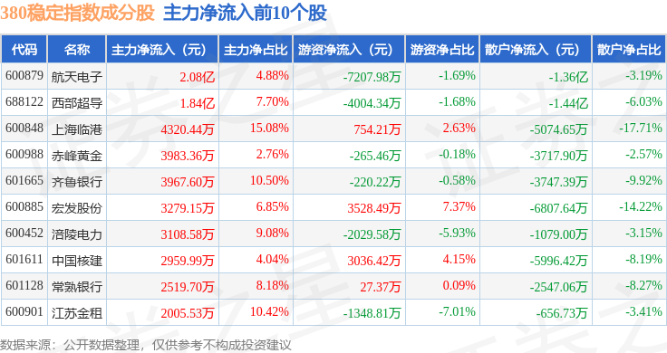 资金流向方面,380稳定(000142)指数成份股当日主力资金净流出合计20.92亿元,游资资金净流入合计9.09亿元,散户资金净流入合计11.83亿元。成份股资金流向详情见下表: