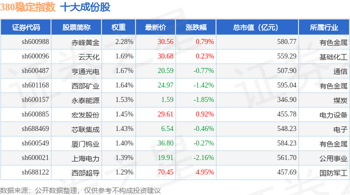 证券之星消息,12月11日,380稳定(000142)指数报收于9539.67点,跌0.56%,成交546.19亿元,换手率1.12%。当日该指数成份股中,上涨的有43家,西部超导以4.95%的涨幅领涨,下跌的有144家,莱克电气以5.53%的跌幅领跌。
