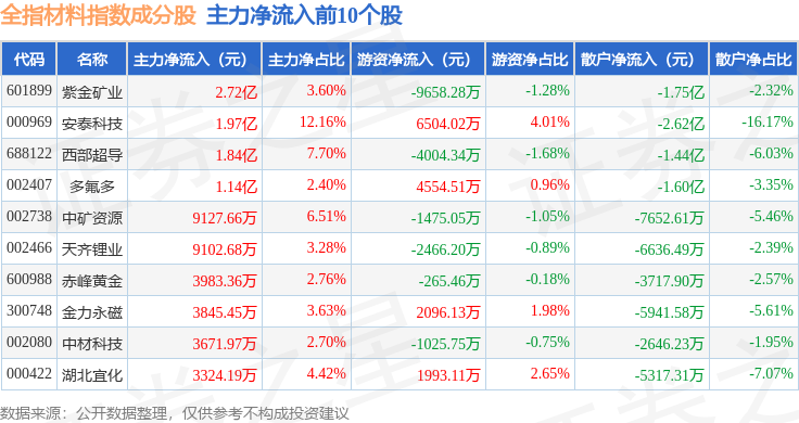 资金流向方面,全指材料(000987)指数成份股当日主力资金净流出合计54.19亿元,游资资金净流入合计14.01亿元,散户资金净流入合计40.19亿元。成份股资金流向详情见下表: