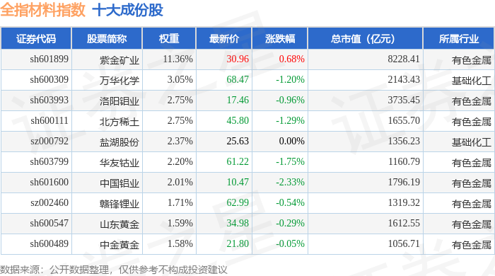 全指材料(000987)指数十大成份股详情如下: