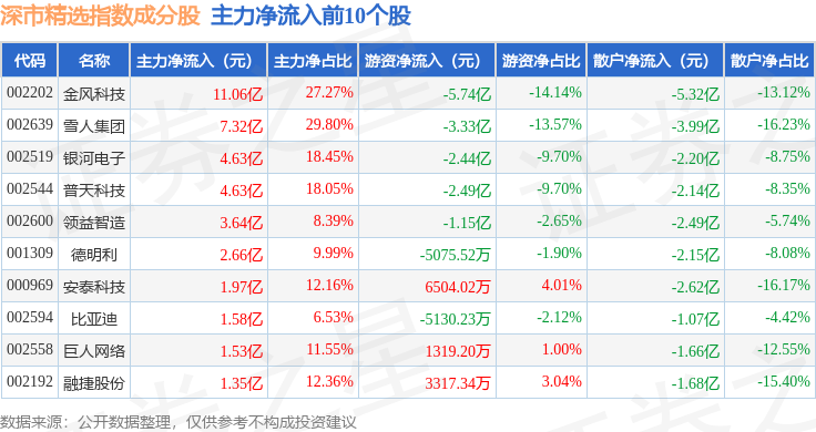 资金流向方面,深市精选(399013)指数成份股当日主力资金净流出合计171.41亿元,游资资金净流入合计30.94亿元,散户资金净流入合计140.47亿元。成份股资金流向详情见下表: