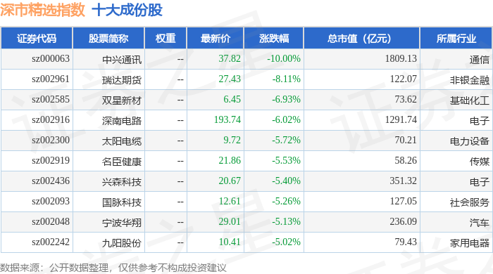 证券之星消息,12月11日,深市精选(399013)指数报收于5336.53点,跌1.25%,成交2920.63亿元,换手率1.77%。当日该指数成份股中,上涨的有84家,银河电子以10.08%的涨幅领涨,下跌的有475家,中兴通讯以10.0%的跌幅领跌。