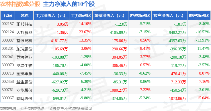 资金流向方面,农林指数(399231)成份股当日主力资金净流出合计5.23亿元,游资资金净流入合计8095.43万元,散户资金净流入合计4.42亿元。成份股资金流向详情见下表: