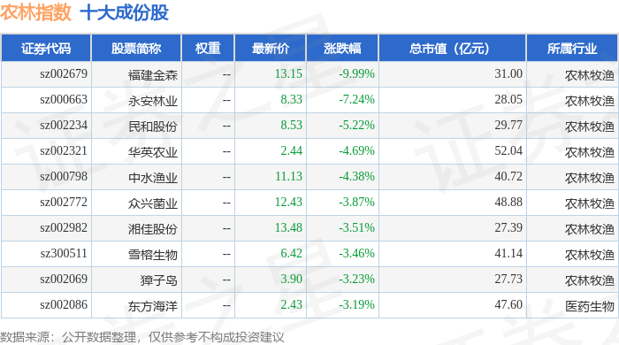 农林指数(399231)十大成份股详情如下: