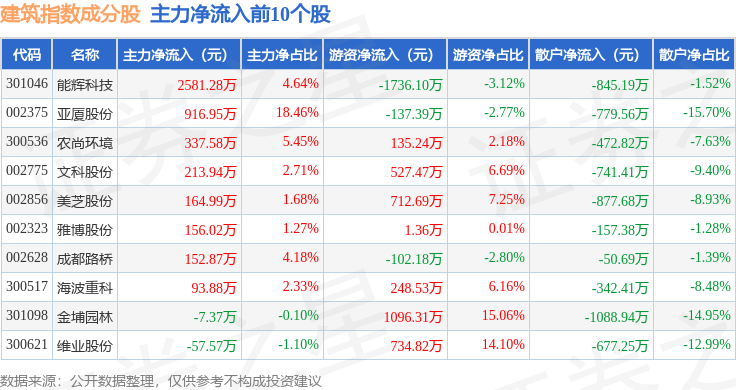资金流向方面,建筑指数(399235)成份股当日主力资金净流出合计12.11亿元,游资资金净流入合计4.04亿元,散户资金净流入合计8.07亿元。成份股资金流向详情见下表: