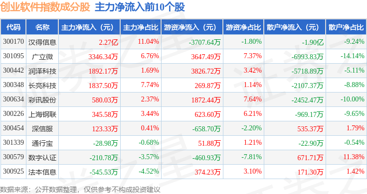 资金流向方面,创业软件(399264)指数成份股当日主力资金净流出合计18.6亿元,游资资金净流入合计4.8亿元,散户资金净流入合计13.8亿元。成份股资金流向详情见下表: