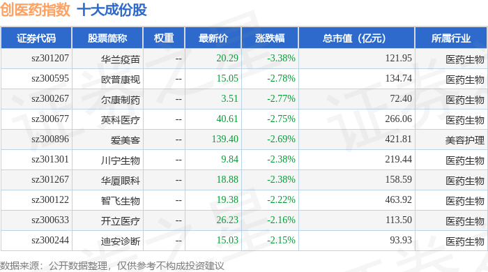 证券之星消息,12月11日,创医药(399275)指数报收于2652.29点,跌1.01%,成交116.33亿元,换手率1.24%。当日该指数成份股中,上涨的有8家,佐力药业以4.24%的涨幅领涨,下跌的有42家,华兰疫苗以3.38%的跌幅领跌。