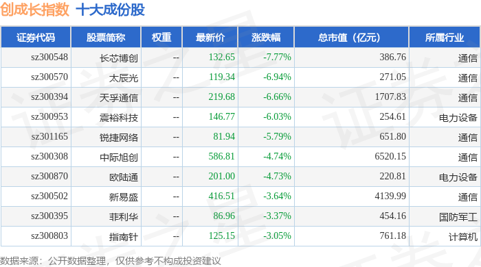 证券之星消息,12月11日,创成长(399296)指数报收于6178.1点,跌2.57%,成交1477.23亿元,换手率2.38%。当日该指数成份股中,上涨的有7家,捷佳伟创以3.16%的涨幅领涨,下跌的有43家,长芯博创以7.77%的跌幅领跌。