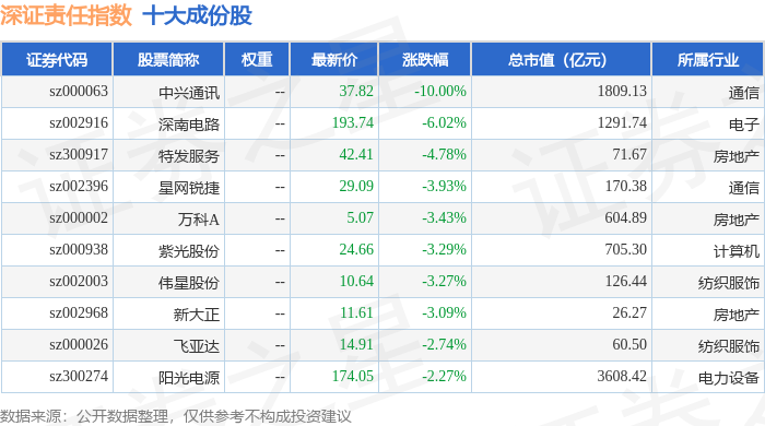 深证责任(399341)指数十大成份股详情如下: