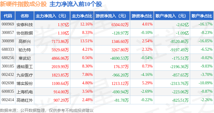 资金流向方面,新硬件(399360)指数成份股当日主力资金净流出合计105.87亿元,游资资金净流入合计29.65亿元,散户资金净流入合计76.22亿元。成份股资金流向详情见下表: