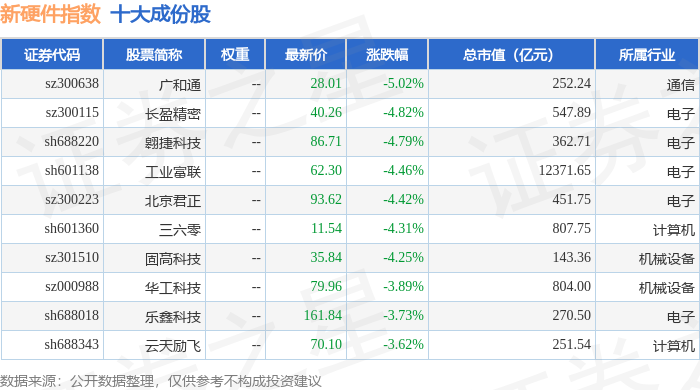 新硬件(399360)指数十大成份股详情如下: