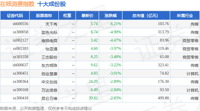 在线消费(399361)指数十大成份股详情如下: