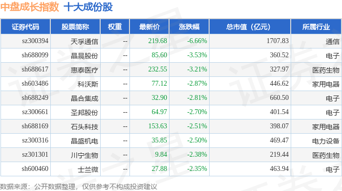 证券之星消息,12月11日,中盘成长(399374)指数报收于4414.61点,跌0.79%,成交792.65亿元,换手率1.32%。当日该指数成份股中,上涨的有23家,迈为股份以12.82%的涨幅领涨,下跌的有75家,天孚通信以6.66%的跌幅领跌。
