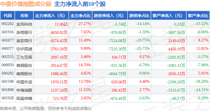 资金流向方面,中盘价值(399375)指数成份股当日主力资金净流出合计17.11亿元,游资资金净流入合计7436.24万元,散户资金净流入合计16.37亿元。成份股资金流向详情见下表: