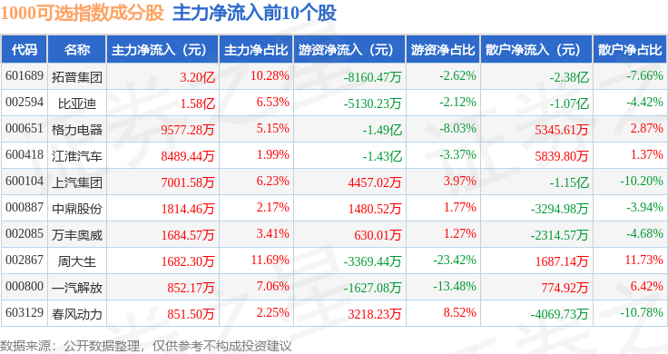 资金流向方面,1000可选(399384)指数成份股当日主力资金净流出合计44.96亿元,游资资金净流入合计4.52亿元,散户资金净流入合计40.44亿元。成份股资金流向详情见下表: