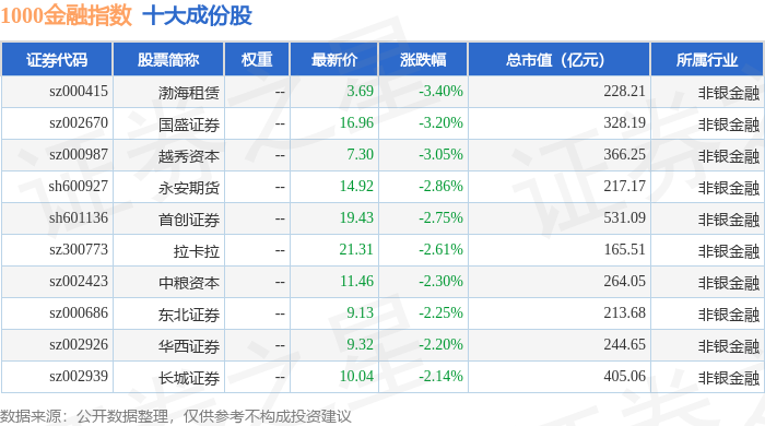 资金流向方面,1000金融(399387)指数成份股当日主力资金净流出合计35.65亿元,游资资金净流入合计10.28亿元,散户资金净流入合计25.38亿元。成份股资金流向详情见下表: