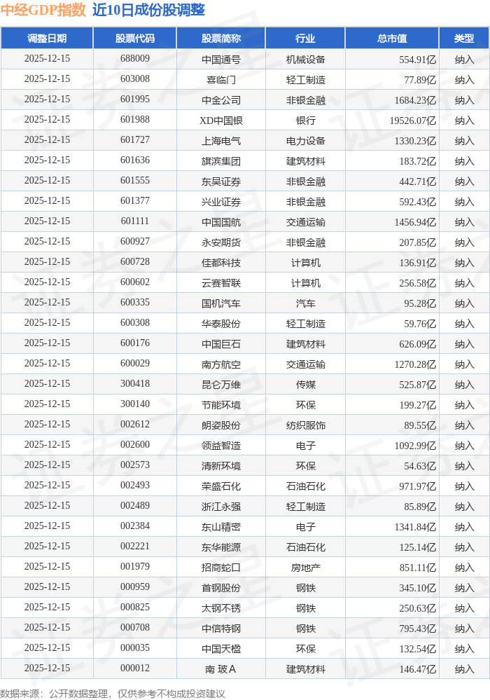 中经GDP(399399)指数十大成份股详情如下: