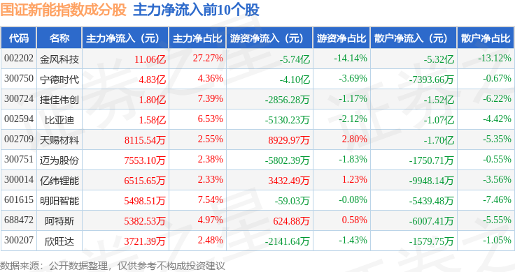 资金流向方面,国证新能(399412)指数成份股当日主力资金净流出合计12.93亿元,游资资金净流入合计1.27亿元,散户资金净流入合计11.66亿元。成份股资金流向详情见下表: