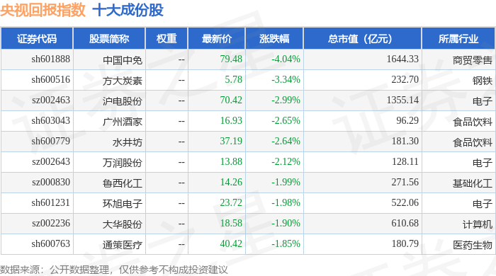 央视回报(399553)指数十大成份股详情如下: