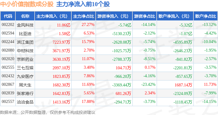资金流向方面,中小价值(399604)指数成份股当日主力资金净流出合计6.01亿元,游资资金净流出合计2.49亿元,散户资金净流入合计8.5亿元。成份股资金流向详情见下表: