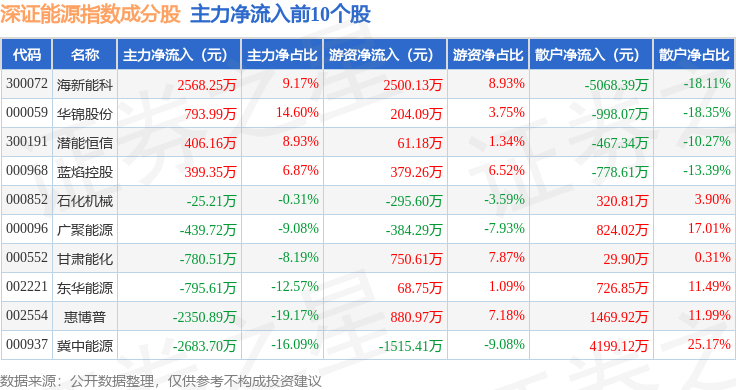 资金流向方面,深证能源(399613)指数成份股当日主力资金净流出合计1.86亿元,游资资金净流入合计9901.64万元,散户资金净流入合计8729.43万元。成份股资金流向详情见下表: