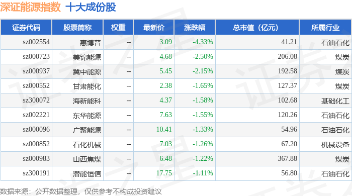 证券之星消息,12月11日,深证能源(399613)指数报收于3291.06点,跌1.36%,成交34.88亿元,换手率1.34%。当日该指数成份股中,下跌的有13家,惠博普以4.33%的跌幅领跌。