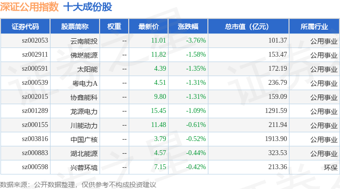 证券之星消息,12月11日,深证公用(399622)指数报收于1703.41点,跌0.31%,成交32.4亿元,换手率0.48%。当日该指数成份股中,上涨的有4家,中山公用以4.12%的涨幅领涨,下跌的有16家,云南能投以3.76%的跌幅领跌。