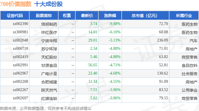 证券之星消息,12月11日,700价值(399629)指数报收于2816.65点,跌1.21%,成交486.81亿元,换手率1.8%。当日该指数成份股中,上涨的有32家,中国天楹以10.09%的涨幅领涨,下跌的有201家,信邦制药以9.88%的跌幅领跌。