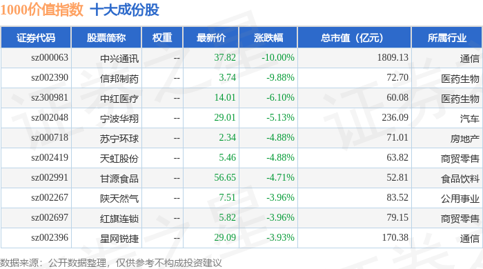 证券之星消息,12月11日,1000价值(399631)指数报收于2199.09点,跌0.99%,成交1351.75亿元,换手率1.22%。当日该指数成份股中,上涨的有48家,重药控股以10.07%的涨幅领涨,下跌的有285家,中兴通讯以10.0%的跌幅领跌。