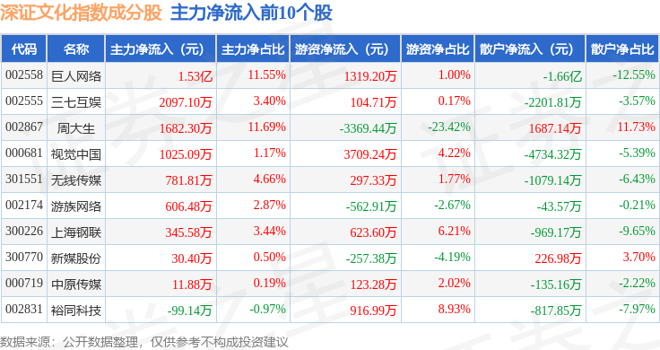 资金流向方面,深证文化(399654)指数成份股当日主力资金净流出合计34.58亿元,游资资金净流入合计4.58亿元,散户资金净流入合计30.0亿元。成份股资金流向详情见下表: