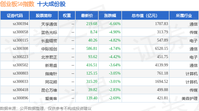 证券之星消息,12月11日,创业板50(399673)指数报收于3366.7点,跌1.52%,成交1662.93亿元,换手率2.8%。当日该指数成份股中,上涨的有6家,蓝思科技以6.06%的涨幅领涨,下跌的有44家,天孚通信以6.66%的跌幅领跌。
