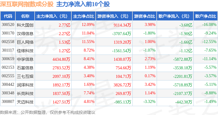 资金流向方面,深互联网(399675)指数成份股当日主力资金净流出合计32.77亿元,游资资金净流入合计8.63亿元,散户资金净流入合计24.14亿元。成份股资金流向详情见下表: