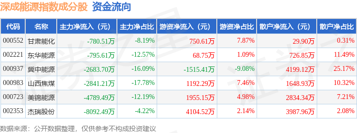资金流向方面,深成能源(399680)指数成份股当日主力资金净流出合计2.0亿元,游资资金净流入合计6555.91万元,散户资金净流入合计1.34亿元。成份股资金流向详情见下表: