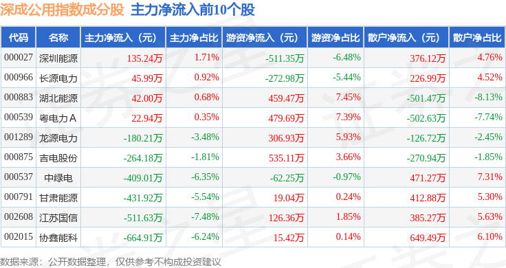 资金流向方面,深成公用(399689)指数成份股当日主力资金净流出合计1.63亿元,游资资金净流入合计4508.12万元,散户资金净流入合计1.18亿元。成份股资金流向详情见下表:
