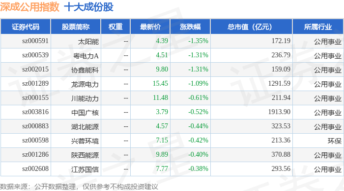 证券之星消息,12月11日,深成公用(399689)指数报收于837.4点,跌0.53%,成交21.02亿元,换手率0.4%。当日该指数成份股中,上涨的有2家,吉电股份以0.18%的涨幅领涨,下跌的有14家,太阳能以1.35%的跌幅领跌。