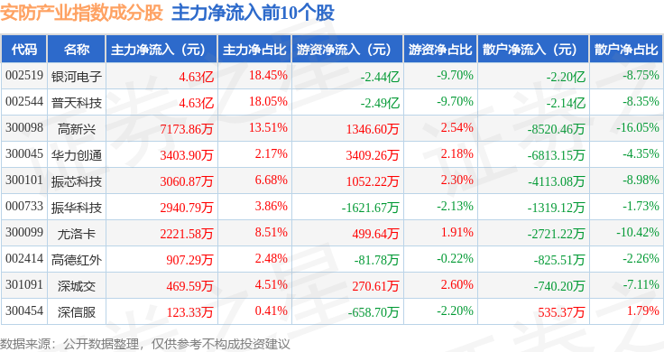 资金流向方面,安防产业(399693)指数成份股当日主力资金净流出合计13.68亿元,游资资金净流出合计1.12亿元,散户资金净流入合计14.8亿元。成份股资金流向详情见下表: